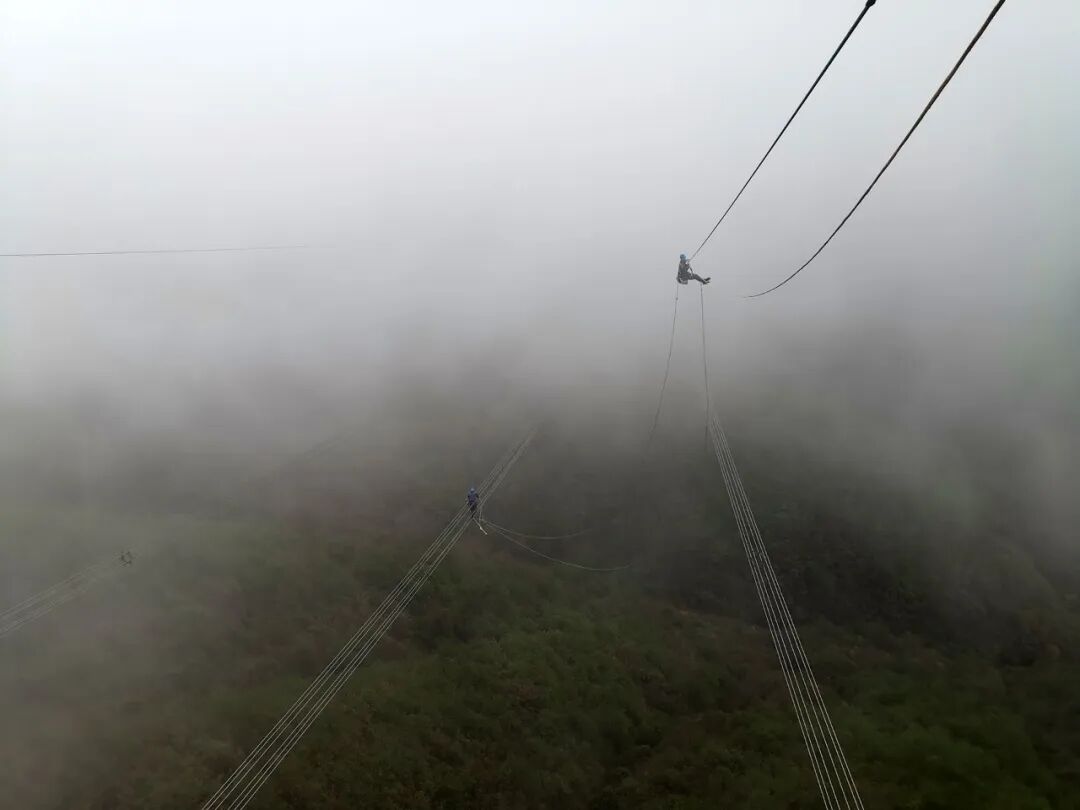 寒潮前夕,南方电网超高压公司柳州局输电所检修人员顶着寒风在架空地线上开展500千伏桂山乙线55#大号侧架空地线复合光缆补强工作,确保在即将到来的雨雪冰冻天气中覆冰监测装置及线路保持安全运行。(韦志勇 摄)