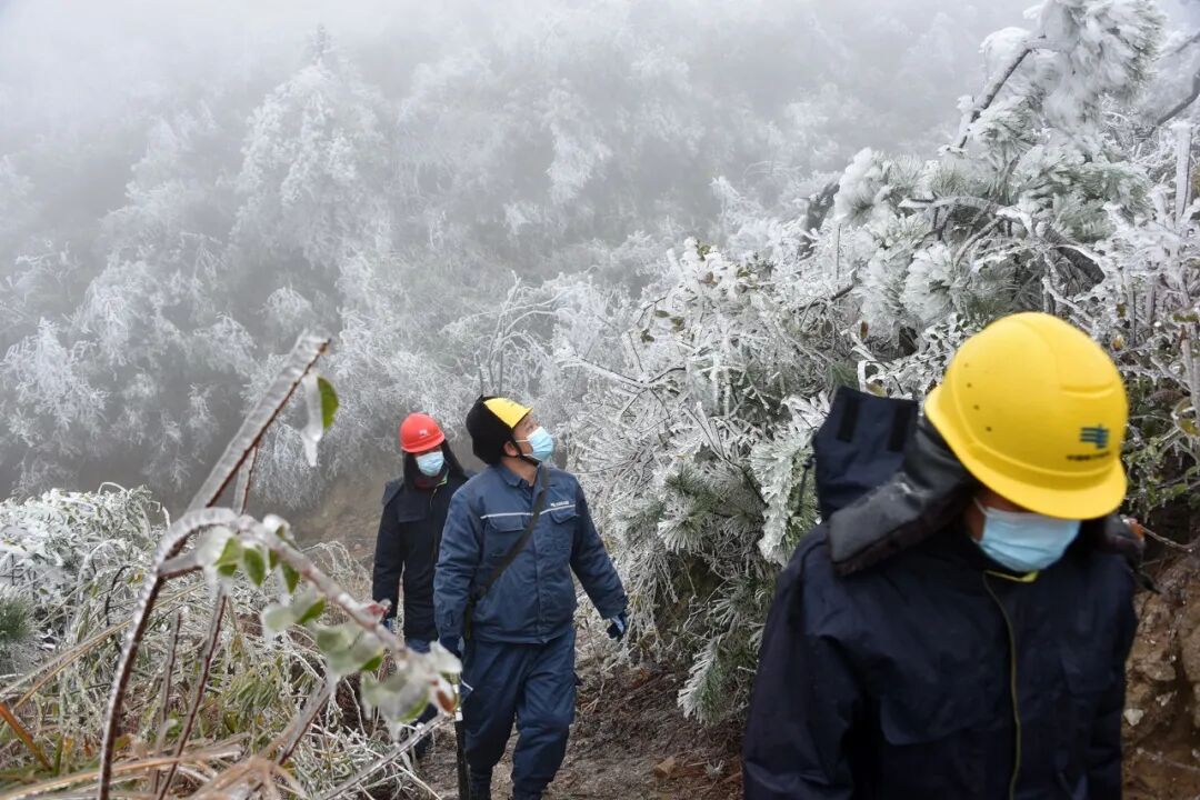 11月30日,南方电网广东韶关供电局的工作人员开展覆冰前线路特巡。(于芳芳 摄)