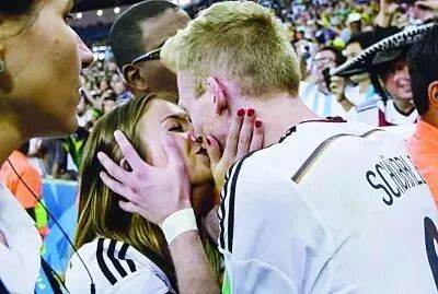 2014的巴西世界杯,当德国1:0战胜阿根廷捧得大力神杯后,作为德国前锋的许尔勒,面对直播镜头呆呆地站立良久,他热泪盈眶,其女友蒙塔娜站在他身边,双目注视着他,许久,许尔勒双手捧着蒙塔娜的面颊,深情亲吻,这一幕羡煞了多少球迷,这感人的一幕必将成为世界杯最经典的时刻之一,让我彻底爱上了这支德国队。
