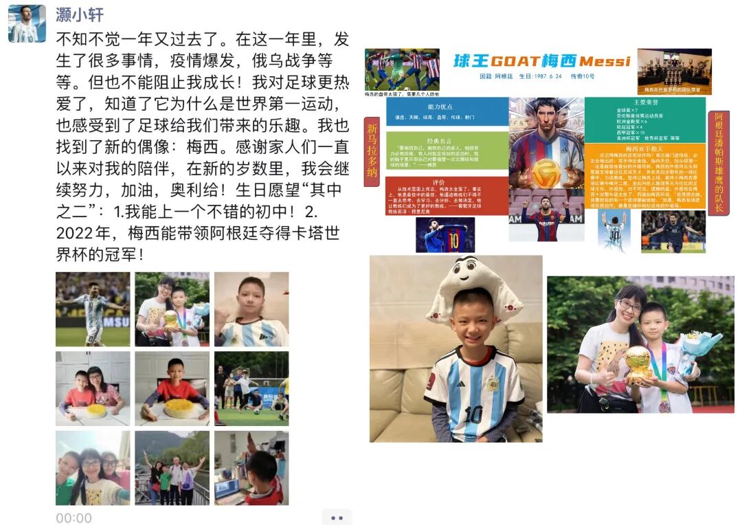 一直以来对足球一点儿不感冒,但自从孩子突然迷上踢足球之后,我却成了“迷妈”,每次都在场外记录下他比赛的精彩时刻。我曾一度搞不清梅西和C罗到底是谁,但看了孩子精心制作的关于梅西的PPT后,我才逐渐了解孩子为何那么喜欢他,就连我也成了他的粉丝。今年的卡塔尔世界杯,只要是阿根廷的比赛,孩子都穿着阿根廷10号球衣观战,满满的仪式感,有时还和同学们通过微信视频连线一起看球。当听到孩子对每支队伍的球员都如数家珍,长串的名字及技术特点都能一字不落地说出来,我也终于明白了为何足球能成为“世界第一运动”。虽然孩子即将小升初,但考虑到这很可能是梅西的最后一届世界杯,我让孩子“狂欢”了一把,惊喜不已的他在作文里如是说:“这就是我的妈妈,我永远爱她!妈妈,有你,真好!”赛场上的欢笑与泪水,那些令人动容的瞬间,都在鼓励我们不到最后一刻都永不放弃。(南网传媒公司 林丹丹)