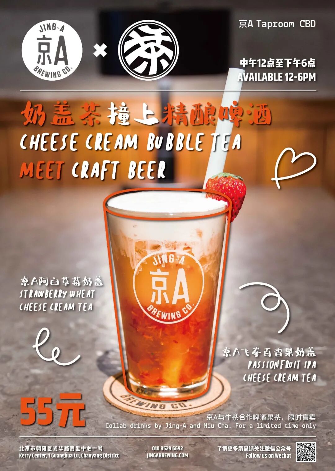 联合奶茶品牌牛茶,我们调制出两款“牛啤茶”:京A阿白草莓奶盖和京A飞拳百香果奶盖。丰厚的奶沫、浓郁的芝士牛奶味、爽口的啤酒味和香气逼人的茶味…还能千杯不醉!