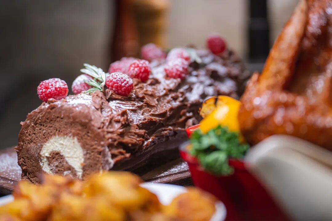 A special roast turkey with cranberry sauce and turkey gravy, honey-glazed Christmas ham, roast potatoes and baby carrots with rosemary, lemon-parmesan brussels sprouts, Yule log, and a secret surprise Christmas cocktail!