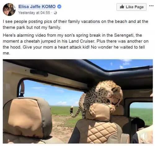 非洲猎豹闯入车后座 游客经历惊险“亲密接触” 美国游客海耶斯和他叔叔在坦桑尼亚的塞伦盖提国家公园游览时,3只猎豹慢慢向他们逼近,其中一只跳上引擎盖四处观望,另一只则从后座钻进来,大约10分钟后才跳车离开。