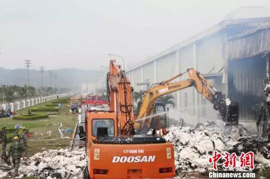 越南芒街中资企业失火 广西防城港消防跨国救援 越南广宁省芒街市一中资企业棉花仓库4日凌晨发生火灾。事发后,中国广西防城港市出动消防机器人等先进设备于5日凌晨成功将明火扑灭。事故无人员伤亡,造成失火企业直接损失近2亿元人民币。