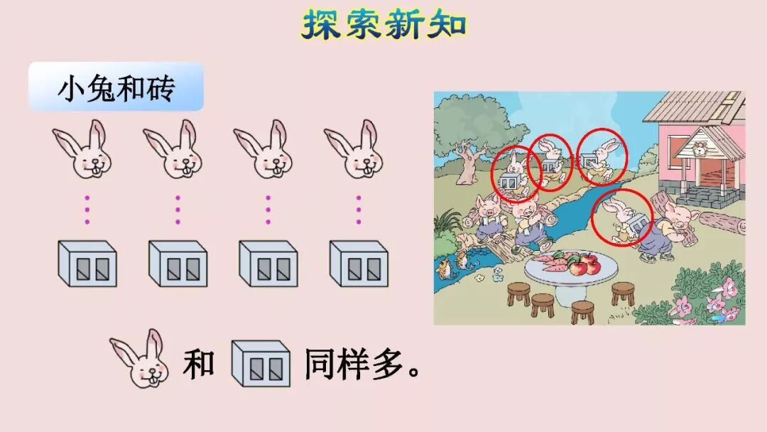 小提示:求一个物体 比 另一个物体 “ 多几 ”或“ 少几 ”的问题,有两种解题方法:①“一 一对应”连线,然后把多的圈起来,数数圈起来的有几个就是多几个。②数一数两种物体各有几个以后作小记号,最后用大数减小数。如: