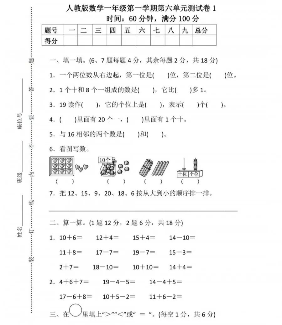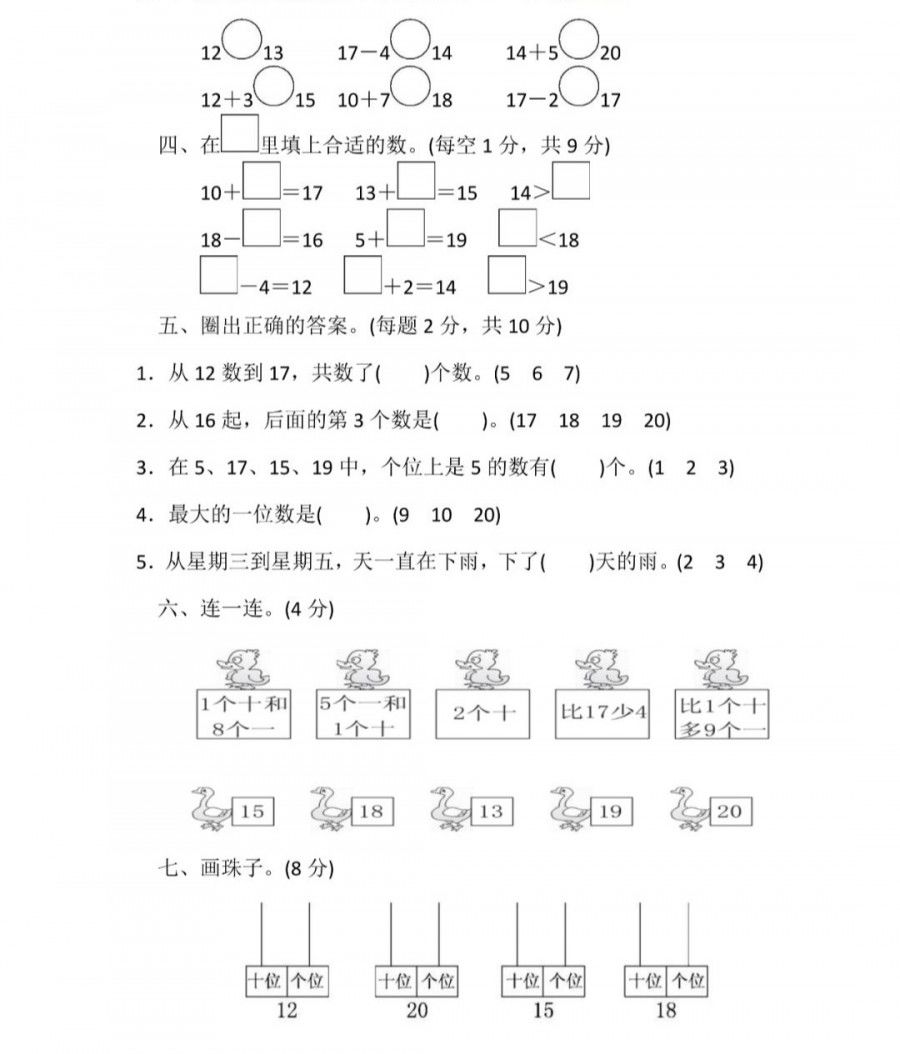 (2)、十几加几和相应的减法的计算方法:计算十几加几和相应的减法时,可以利用数的组成来计算,也可以把个位上的数相加或相减,再加整十数。
