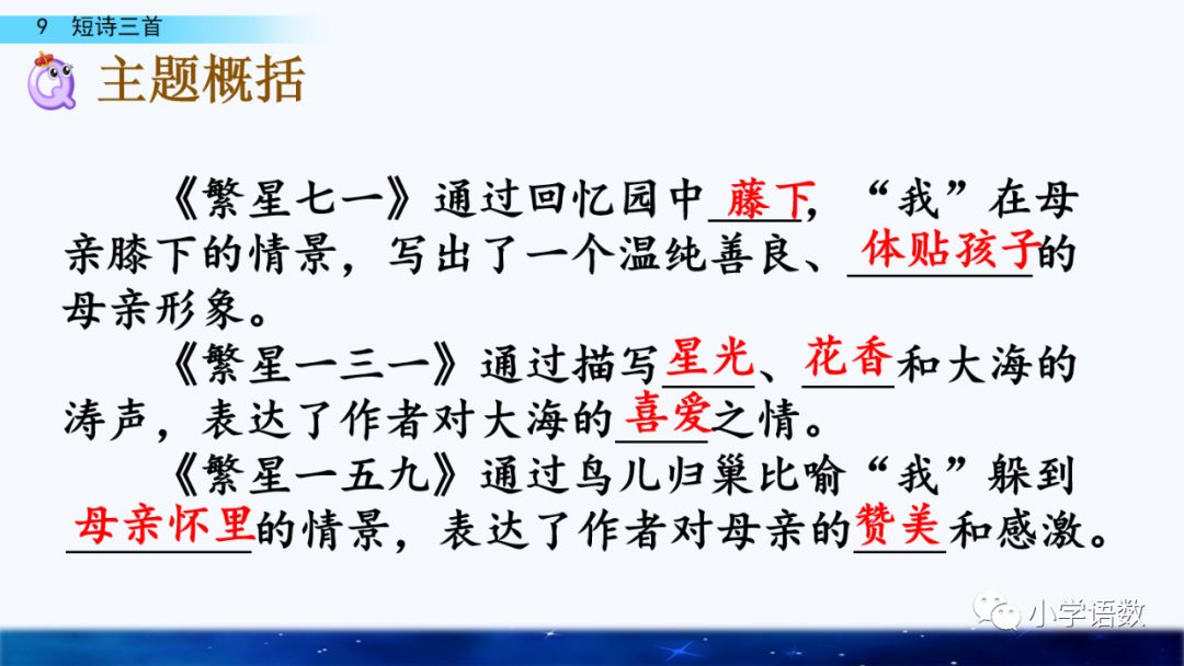《繁星(七一)》:通过回忆小时候的事,歌颂了童真和母爱。
