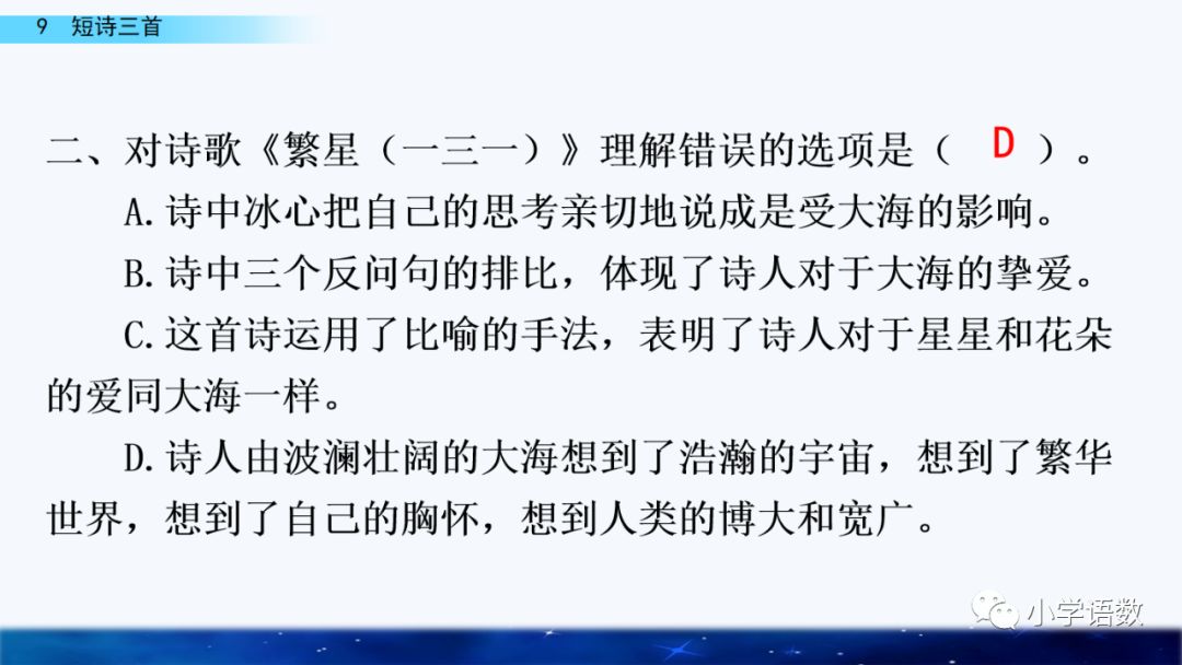 《繁星(一三一)》:用排比、反问的形式,表达了诗人对波澜壮阔的大海的赞颂。
