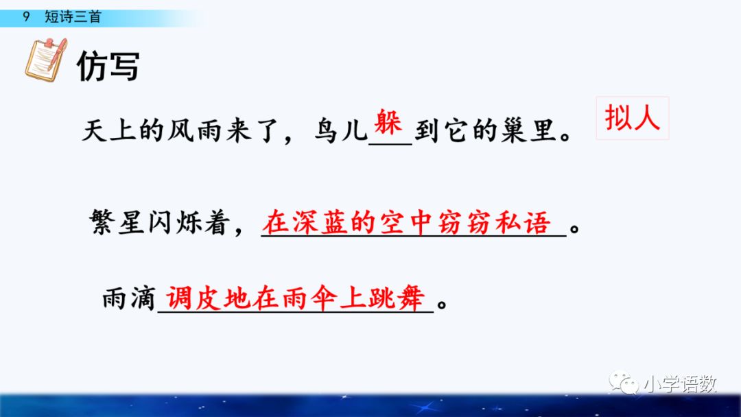 二、1.鸟儿躲到它的巢里,我只躲到你的怀里。