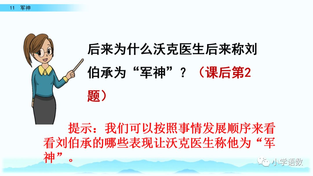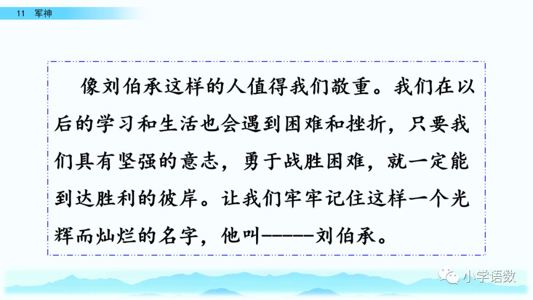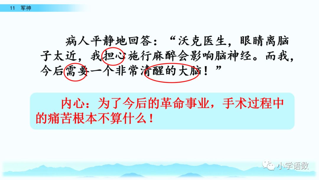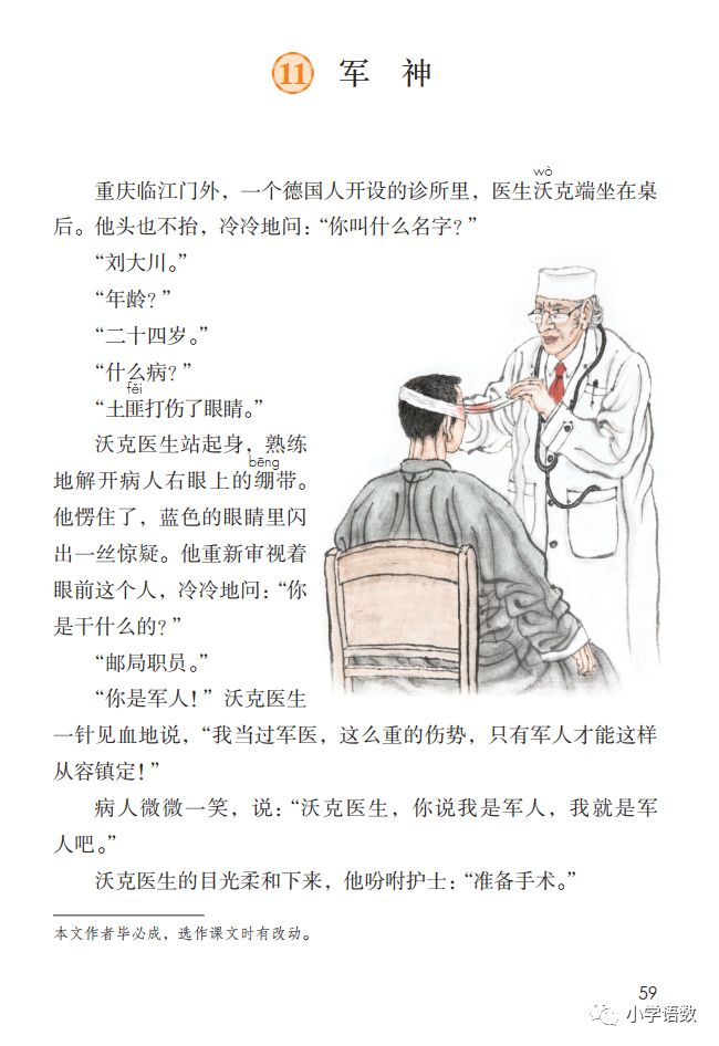 《军神》是部编本人教版五年级小学语文课本的一篇精读课文。本文主要讲述了刘伯承到一家外国诊所做眼部手术,拒绝使用麻醉剂,为他做手术的外国医生沃克称他为“军神”的故事,赞扬了老一辈无产阶级革命家在严酷的革命斗争中表现出来的钢铁般的意志。本文以“手术前——手术时——手术后”为序组织材料,以人物对话为主线,推动故事向前发展,并通过对人物语言和沃克医生神态、情绪变化的描写来表现刘伯承钢铁般的意志。