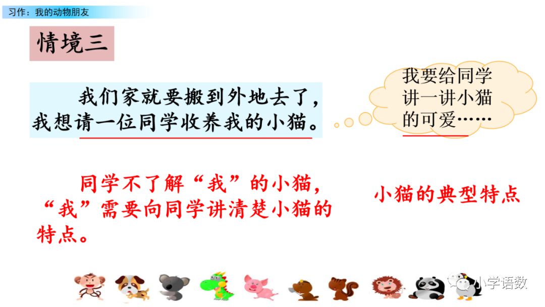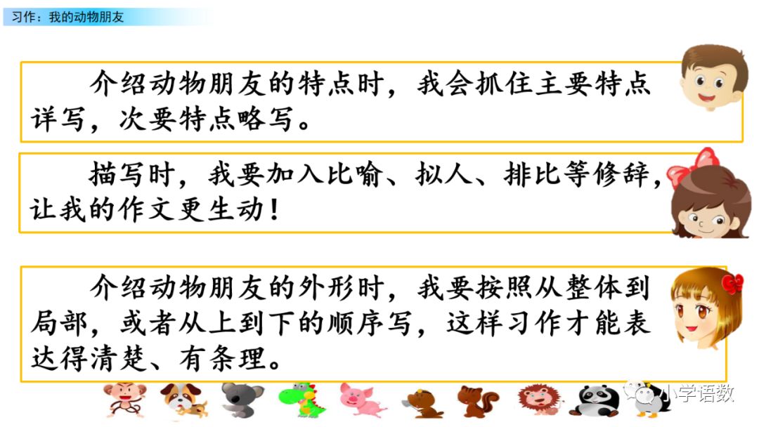 如果留心观察,就会发现许多发生在动物身上的事情,写的时候应该选择有意思的事情,这样才能吸引读者,同事更能表达出自己的情感。动物虽然不像人一样会思考、会说话,但是,它们也有自己的“喜怒哀乐”。我们在观察描写时,就应该从它们的动作、叫声中去体会和想象它们的“情绪、思想”变化。这样适当运用比拟,文中的动物才会更逼真。