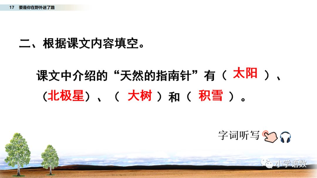 3、你还知道哪些大自然的指南针,请仿照课文的2-5节写一写。