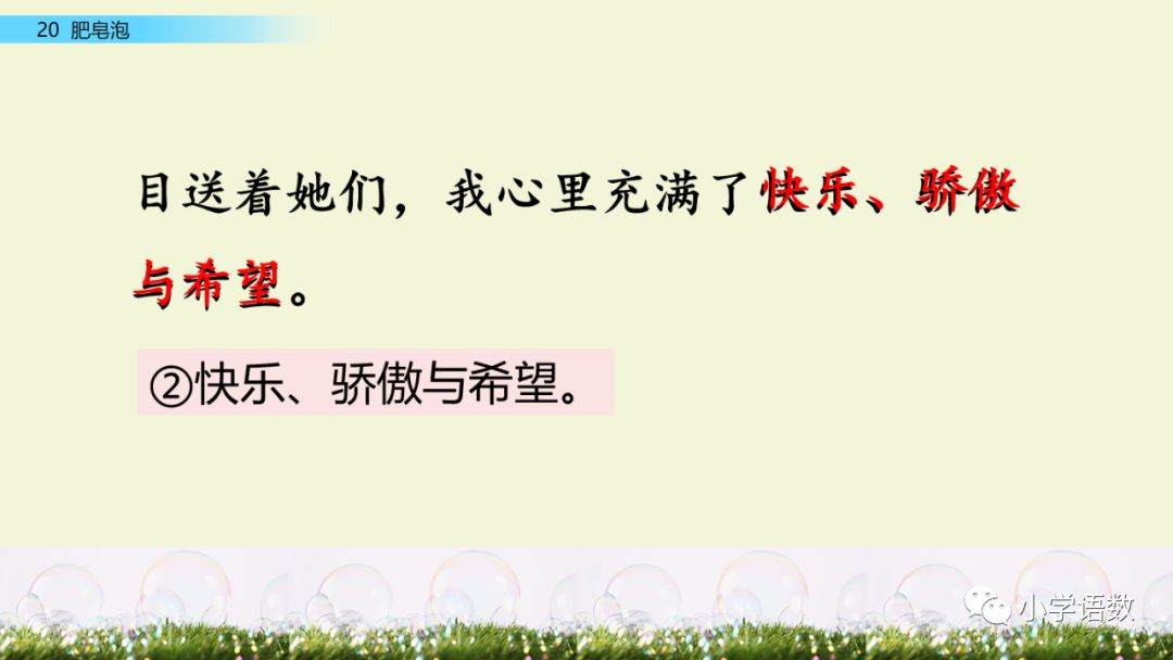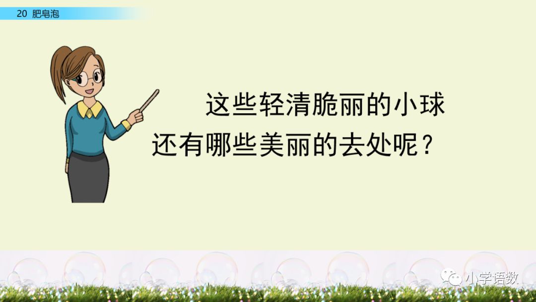 这既是比喻句又是排比句。作者把“小球”比作“一个美丽的梦”。四个“那么……”写出了肥皂泡的圆润、自由、透明和美丽的特点,这也是我们喜爱泡泡的原因之二。