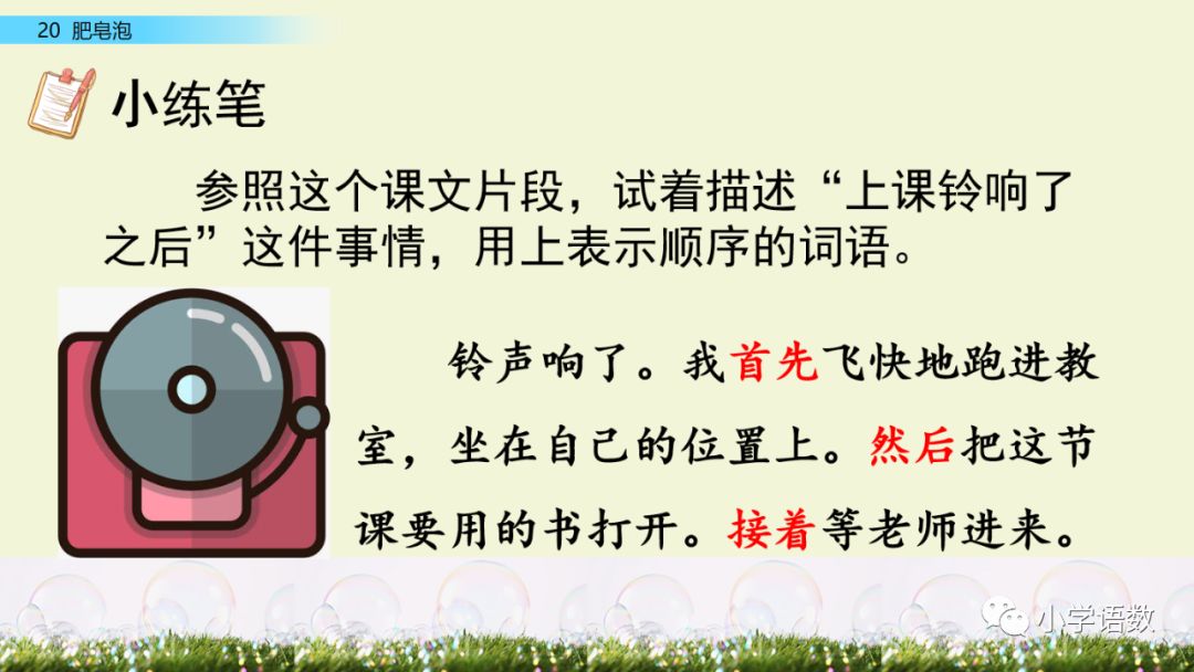 用先后顺序说说我是怎样吹肥皂泡的。说的时候用上“先……,然后……,再……”的句式。