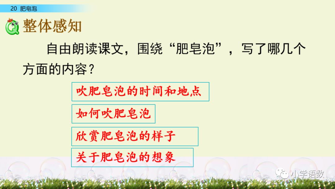 一、朗读课文。用自己的话说说吹肥皂泡的过程。