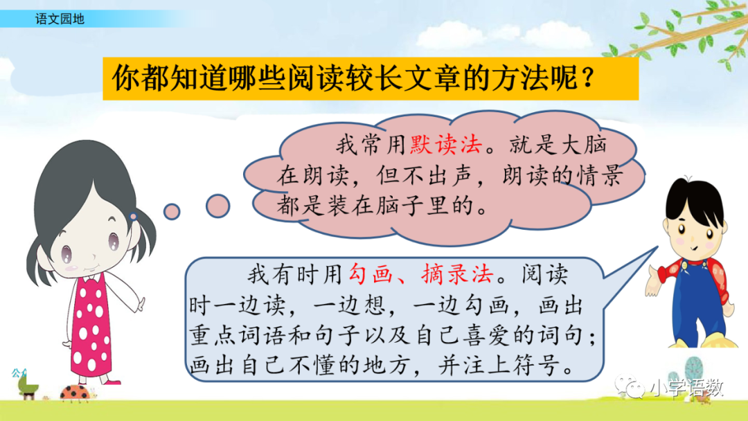 2、勾画、摘录法。阅读时一边读,一边想,一边勾画,画出重点词语和句子以及自己喜爱的词句,画出自己不懂的地方,并注上符号。