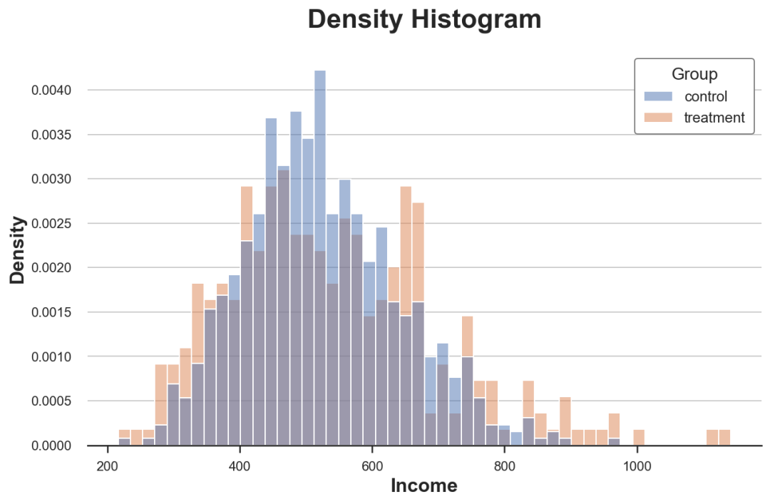 让我们从最简单的开始:我们想要比较整个实验组和对照组的收入分配。我们首先探索可视化方法,然后是统计方法。第一种方法的优点是可以使用我们的直觉进行判断,第二种方法的优点是使用数字判断更加的严谨。