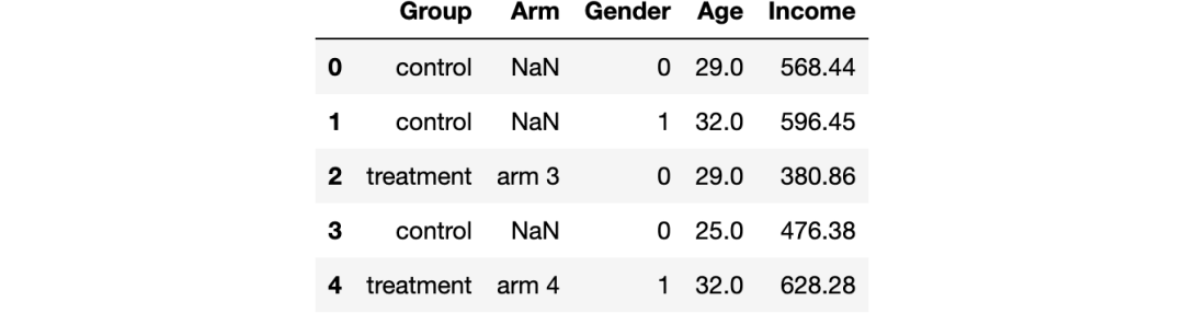 我们有1000个人的信息,观察他们的性别、年龄和周收入。每个人要么被分配到4个不同的实验组要么被分配到对照组。