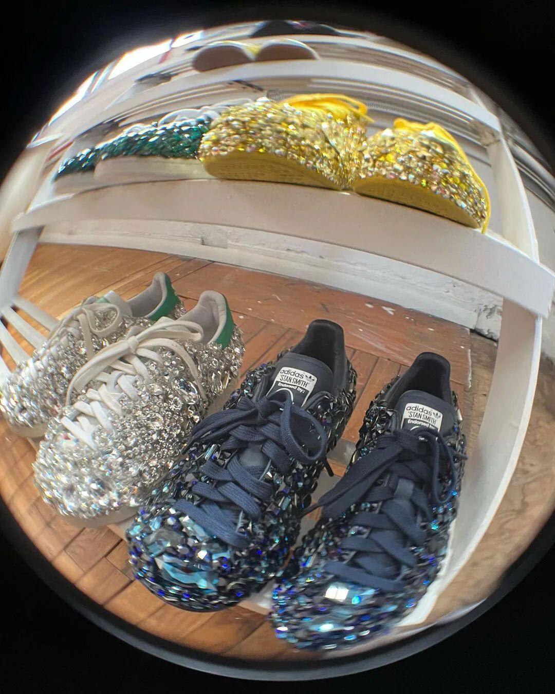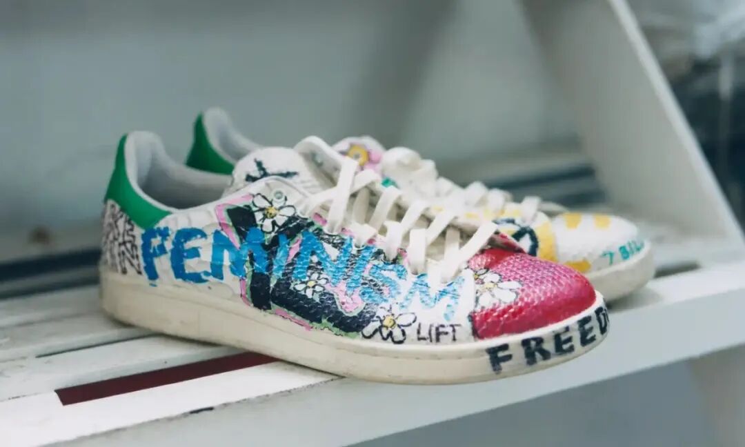 不只 BAPESTA,此次拍卖的鞋款方面还包括几双鞋身镶满 1600 颗施华洛世奇水晶和手绘有「Feminism」女权主义字样的 Stan Smith,以及曾在好莱坞星光大道上被授予星形奖章时脚上的 Timberland x BBC Bee Line 手绘靴子等等。
