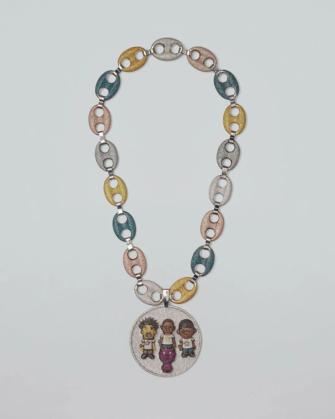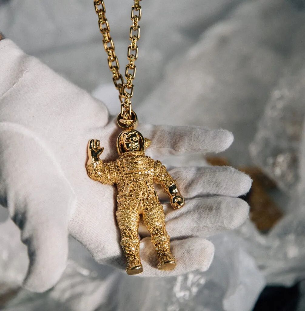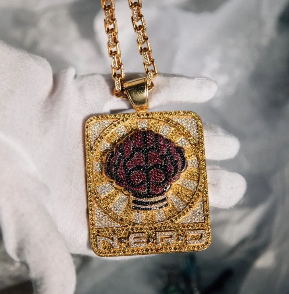 这款由珠宝品牌 Jacob & Co. 量身定制的 Billionaire Boys Club 吊坠项链,采用总共 14 克拉的黄金加黄钻打造,上面的人物形象来自于 N.E.R.D. 组合成员,作为早期 Pharrell 最常佩戴的「浮夸」配饰曾亮相于很多场合,应该令不少人记忆犹新。