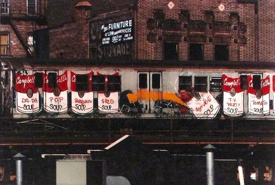 1980 年,纽约街头涂鸦艺术家 Fab Five Freddy 将 Warhol 的 Campbell’s Soup cans 绘到了地铁车厢上引起不小的轰动,这班从 hip-hop 文化起源地纽约布朗克斯开至曼哈顿城区的地铁,也象征着自由的、无阶级壁垒的涂鸦文化开始呈现新的面貌。