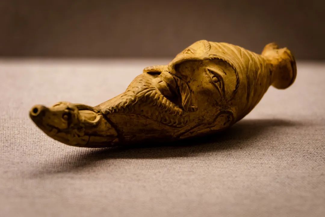 不仅是储酒,饮用的器具也带有异域色彩。这一件人首牛头陶水注,形如漏斗,雕琢精巧,它的造型就来自于希腊的传统器具“来通”,即用来注酒的角杯。而水注旁边的玻璃杯,更是玻璃制造技术由两河流域东传的绝佳例证。这一件玻璃杯作为典型的伊朗式玻璃,采用了凹球面装饰的技术,造型典雅,价值贵重,是当时高级身份的象征。