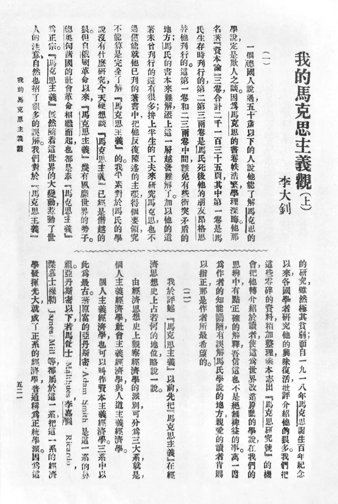 1919年,李大钊在《新青年》第六卷第五、六号上发表的《我的马克思主义观》,系统地阐述了马克思主义理论的三个部分。这是马克思主义在中国广泛传播过程中极为重要的一篇文章。