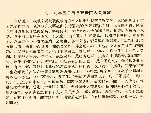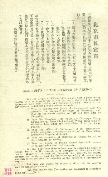 五四运动的三个北大宣言(自上而下:北京大学学生罗家伦起草的《北京学界全体宣言》、北京大学学生许德珩起草的《北京学生界宣言》、北京大学教授陈独秀起草的《北京市民宣言》)