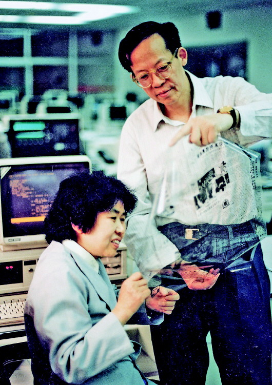 1985年,激光照排系统在新华社投入使用。这是王选和技术人员查看用系统排印出的《新华社新闻稿》