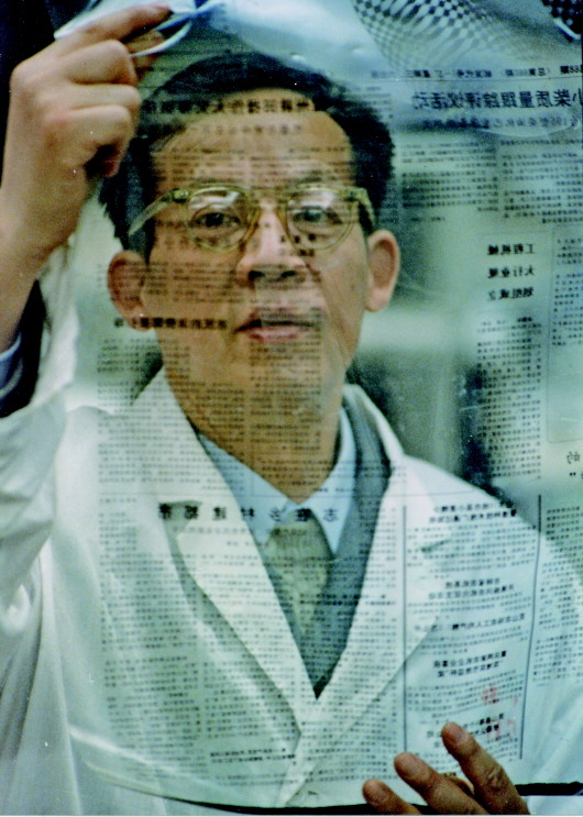 王选正在查看用激光照排系统输出的报纸胶片