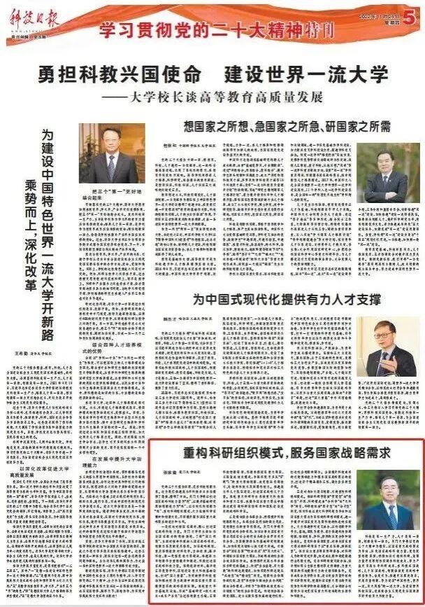11月24日,《科技日报》“学习贯彻党的二十大精神特刊”推出主题为“勇担科教兴国使命 建设世界一流大学——大学校长谈高等教育高质量发展”专版。
