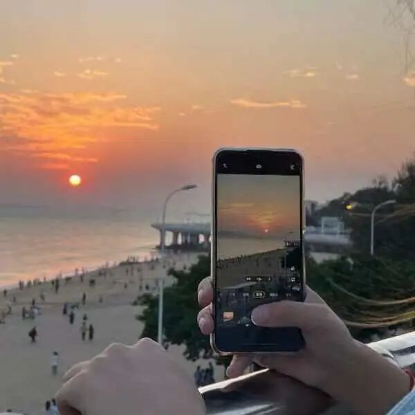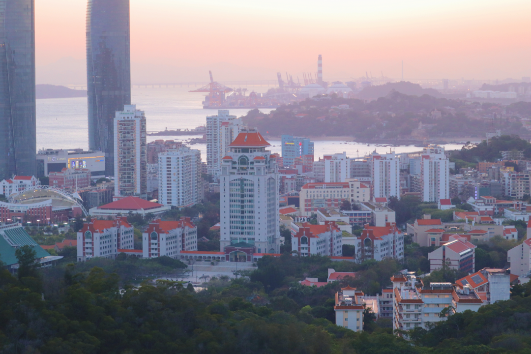 登山远眺,山海之间,暮色渐浓,厦园在朦胧余晖的照耀下呈现出橙粉色,久违沉醉于这温暖的傍晚。