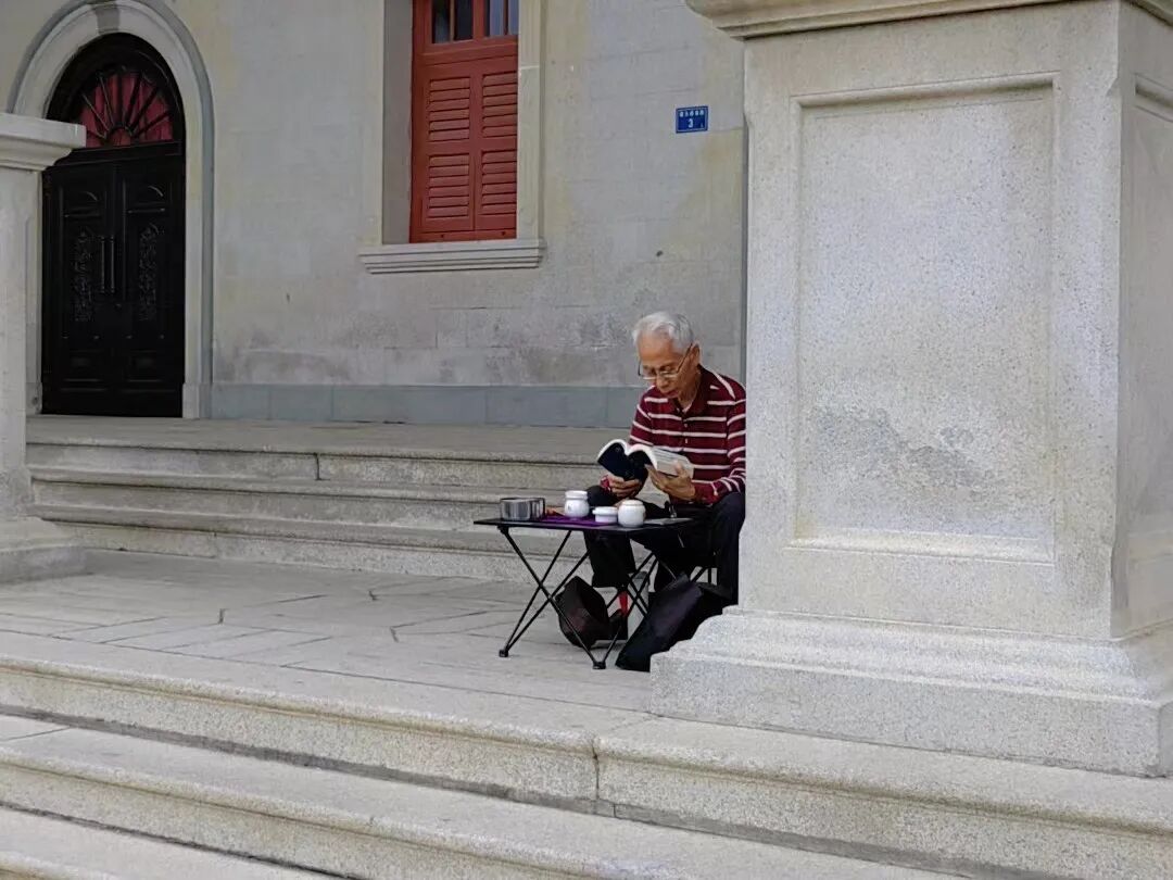 下午匆匆忙忙赶去上课,路过建南大会堂,看到一位老爷爷支起小桌板,一边泡茶一边看书,眼前多少人路过也不抬头。他周围的时间都慢了下来,让我觉得好安心。