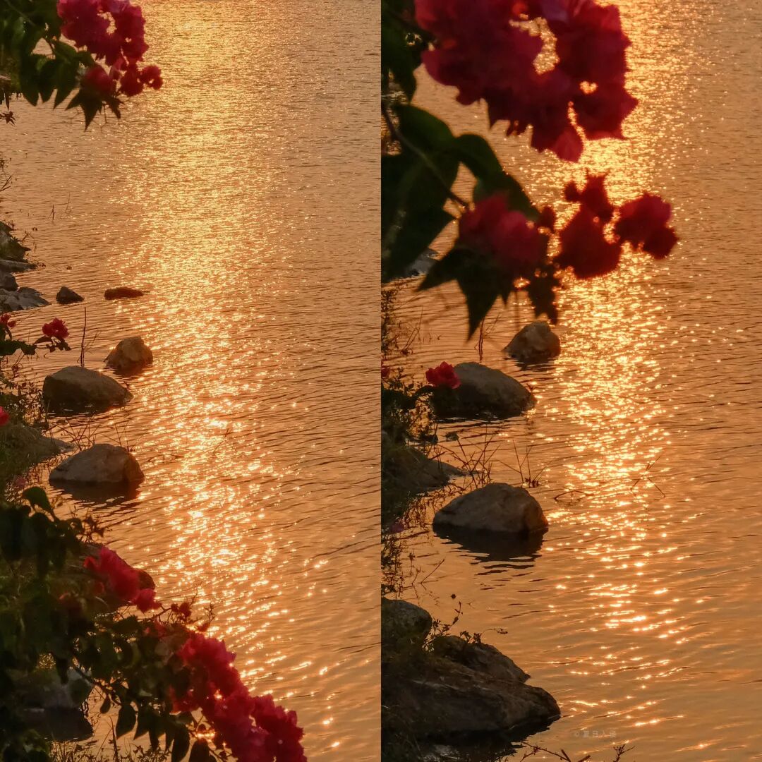 黄昏下波光粼粼的芙蓉湖与三角梅,画面太美好。