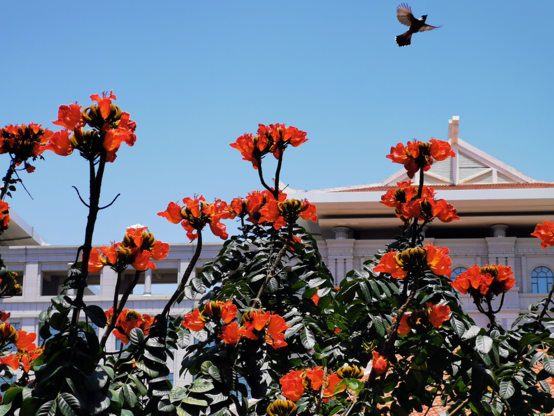 课间路过走廊,偶然发现了开得正盛的火焰树,艳丽的花朵和碧蓝的天相衬,枝丫间还有蹦跳的小鸟。忍不住在一旁蹲守,拍下了鸟儿振翅的一瞬。被这生命的绚丽治愈了!