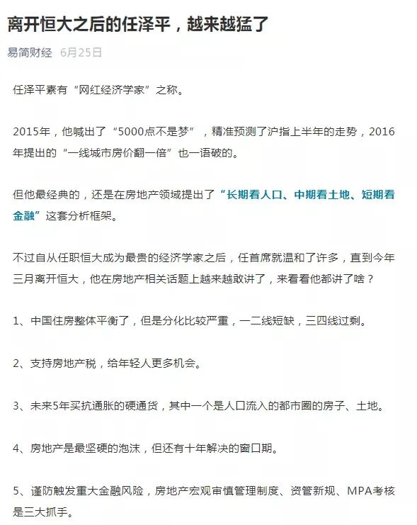 或许,正是任泽平感知到了地产行业的风险,才有了他离职的一幕。离职后,任泽平提示房地产是最坚硬的泡沫,建议避免硬着陆。当然,从恒大地产离职,回归券商行业,也是他认为资本市场的重大机遇来了。正如任泽平在致谢感言中所表述的——随着注册制改革,发展多层次资本市场,国家鼓励创新,中国资本市场正迎来长期发展的重大机遇。离开地产圈之后的任泽平,没有了地产公司背景的束缚,他也变得更敢说了。客观上,任泽平端着地产商的饭碗,基于回避原则,他对地产行业说好说坏都不合适。但在网上盛传的“中国未来10年一二线城市房价翻二倍,三四线城市房价翻三倍”这一言论,不管是任泽平入职恒大前还是之后都未曾说过这种预判,从泽平宏观公号、公开媒体采访专访、外部演讲等均未有权威真实出处,实为坊间借他之名杜撰,却因观点劲爆而被一些文章不加甄别地引用。因此,我们会发现,他在恒大期间,鲜少对于地产行业进行公开的预判,更不用说惊人论断。这一点6月25日“易简财经”公号就提及了任泽平离开恒大前后的预判变化——《离开恒大之后的任泽平,越来越猛了》。