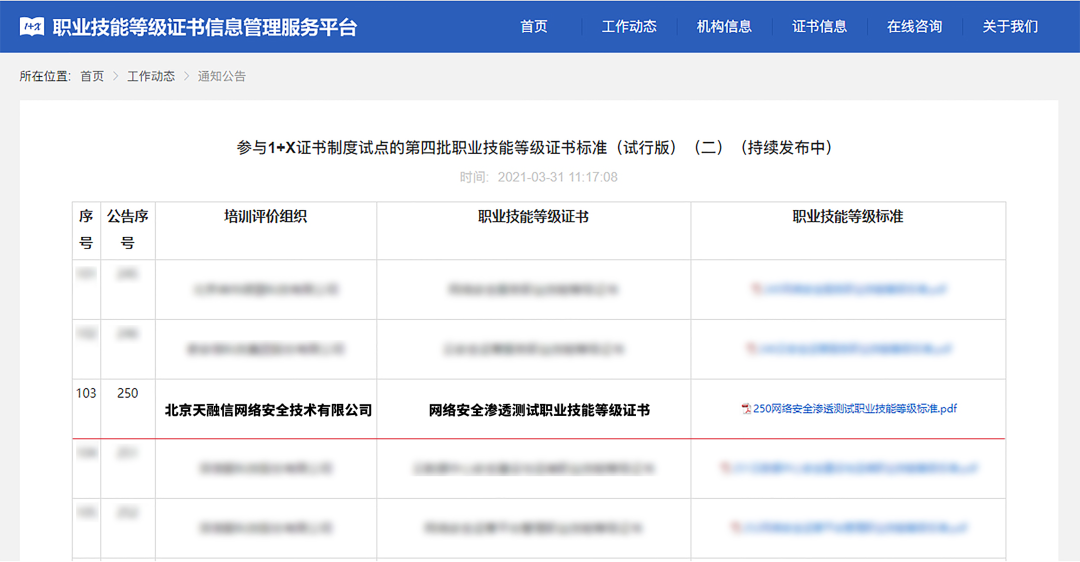 近日,职业技能等级证书信息管理服务中心发布了《参与1+X证书制度试点的第四批职业技能等级证书标准(试行版)(二)》。本次发布了159个职业技能等级证书标准,天融信成为教育部1+X证书《网络安全渗透测试职业技能等级证书》的证书评价组织。