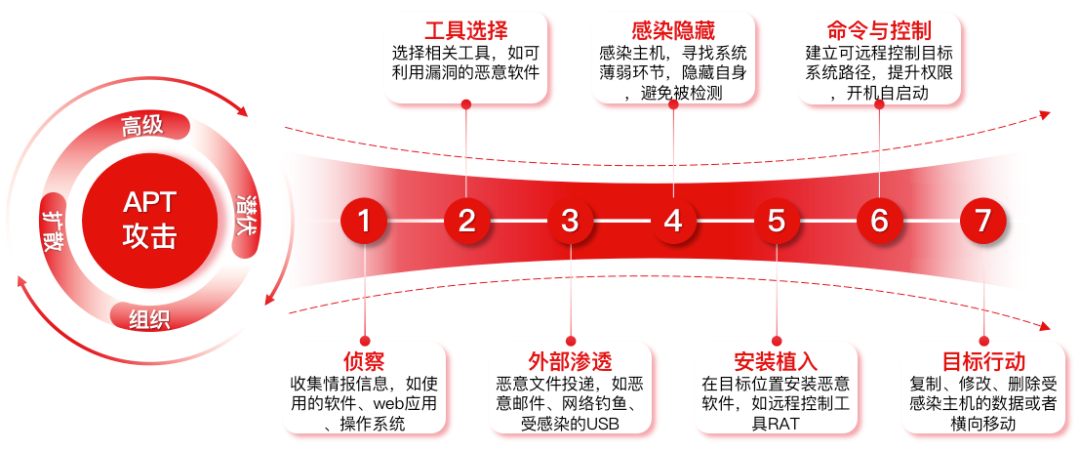 APT攻击从锁定目标到目的实现要经历多个阶段,即攻击链,大致可分为侦察、工具选择、外部渗透、感染隐藏、安装植入、命令与控制、目标行动这七个阶段。![]()