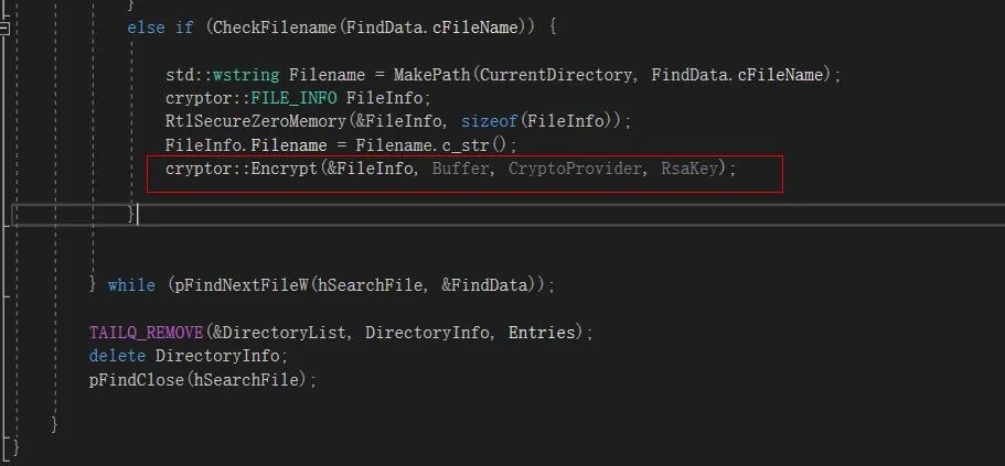 在遍历文件的函数中使用核心加密函数cryptor::Encrypt函数开始加密文件。![1651044148566476.jpg]()