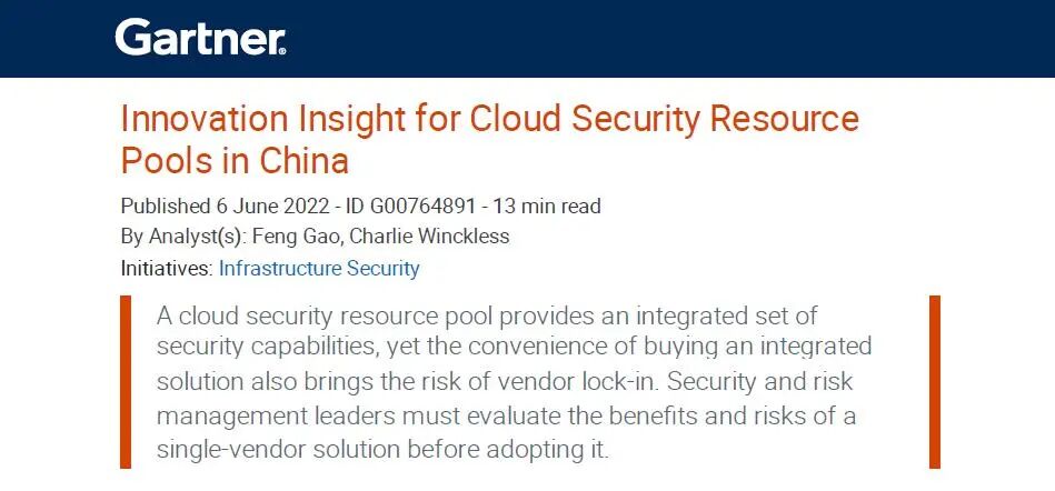 近日,国际权威咨询机构Gartner正式发布中国云安全资源池创新洞察报告,天融信凭借在云安全领域的卓越表现,强势入选云安全资源池代表厂商。