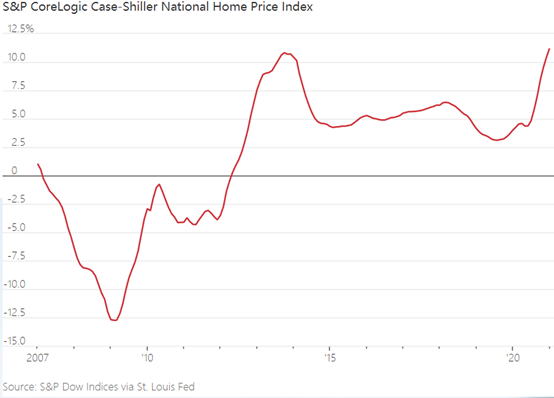 标准普尔Case-Shiller的房价指数显示,今年1月全美主要大城市平均房价同比上涨了11.2%,创下2006年2月以来的最高涨幅。