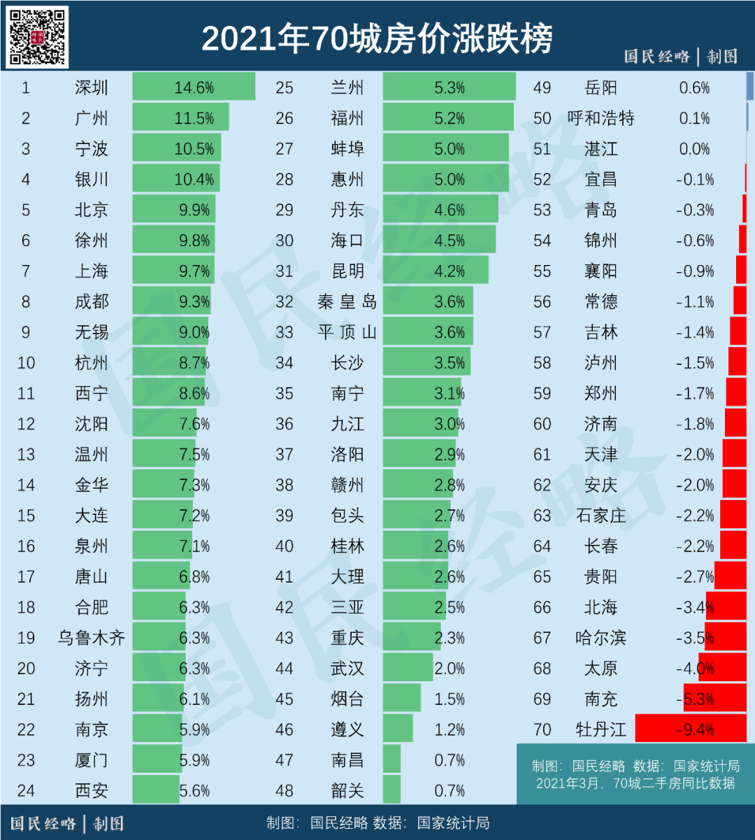 这是国家统计局发布的2021年3月70个大中城市二手房价同比走势: