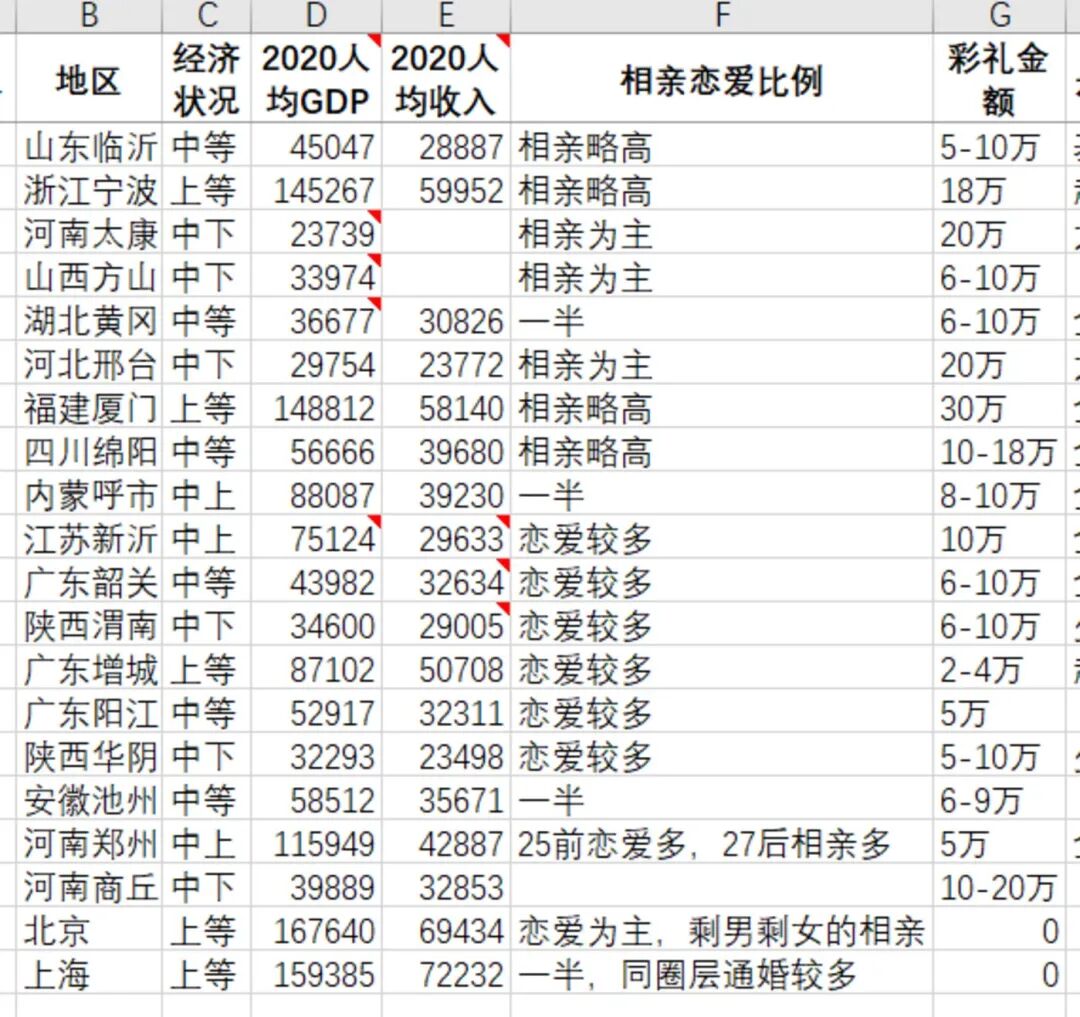 前些年就有人发现了一个规律,一个地方的彩礼金额往往和其经济发展水平呈负相关关系。即:经济越发达的地区彩礼更低;而越是经济欠发达的地区,彩礼反而越贵。比如:作为国内经济最发达的大城市,上海就没有彩礼这么一说,以至于被人编成了上海第一怪的段子里。北京的情况也和上海相似,只要一方能提供房子即可。而云南、贵州、河南、河北等经济欠发达省份,则和江西一样存在着彩礼习俗,而且有些地方金额也不低。只是和江西相比,其他欠发达省份的彩礼金额整体低了一大截。世纪佳缘发布的2016—2017年中国男女婚恋观调研报告中,江西便与福建、浙江、江苏、山东等发达省份列为起步价最高档。请注意,上图反映的是四五年前情况,现在西北、华北一些地方的行情或已反超华东。在2018年,网络上便有人收集总结了江西11地级市的彩礼行情。其中赣州最高,在10万以上,南昌10万元上下,而其他地市多5-10万之间。对比现在的行情,这份排名显然已经过时,因为10万元上下的彩礼在江西基本绝迹。回头看这份清单上的价格很低,但在当时却是国内最高。要知道,时至今日,在与江西人均GDP相近的广东欠发达地区,如增城、阳江等地的彩礼也不超过5万元。现在江西彩礼是多少呢?今年春节期间,一个江西相亲的短视频在网上广为传播。一对大学毕业的男女青年在一起相亲,女方向男方开出了50万彩礼的要求,而男方亲友(或媒人)则一直夸赞男方的潜力,试图说服女方免去彩礼。50万元!江西彩礼随着这个视频的流传再次刷新了纪录,加剧了省外对江西彩礼的负面看法。因为天价彩礼与江西女友分手的帖子,屡屡见诸网络,一次又一次地强化了江西人“贪财、拿女儿卖钱”的刻板印象。除了金额高和收入低的强烈反差外,江西彩礼容易在网上形成传播热度还有另一个重要原因:江西风俗是彩礼需当众展示,以百元现金的方式在定亲仪式摆放出来。于是常常可以在网上看到这样简单粗暴的场景,数十捆百元大钞以各种方式铺放在桌子上,给人造成的视觉冲击力非常强烈。以上面两个视频为例,目测其彩礼都在30万元以上。动辄三五十万元,江西的彩礼真的都如此天价吗?我花费近1个月的时间,在微信好友间作了一次小范围的访谈调查(以下简称小调查,声明:由于样本较小存在一定误差,只能简单定性),汇总得到的结果如下图。不难看出,江西各市县存在着一定的差异,整体基准在20万上下;较高的市县20万元起跳,通常在20-30万元之间;而较低的市县则普遍在15万元起跳,通常不超过20万元。另外,值得注意的是,市县内的城乡差距很小,彩礼价格基本统一;甚至可能出现乡镇农村略高于城区的现象,比如南昌市区的彩礼就明显低于南昌县、进贤县等郊区。这些是大多数市县的主流行情,不排除更低或更高的现象。从反馈来看,超过主流行情的彩礼出现的概率,明显比低于行情的要大得多。调查反馈发现,50万元这样的天价彩礼确实在江西存在,但属于个例并非主流。视频上传者往往出于对彩礼金额感到吃惊而拍摄,这就使得在网上传播的视频基本是超过平均水平的天价彩礼。在一定程度上,江西彩礼金额被这些选择性偏差的天价视频放大了,实际平均金额并没有这么高。与此同时,我还顺手了解了一下其他省市的彩礼情况,收到了十几份资料。果然基本显示出了地区越穷彩礼越高的规律:北京上海这样的一线城市几乎没有彩礼这个概念,广东增城、河南郑州等较发达城市的彩礼基本属于象征意义,而河南太康、河北邢台、河南商丘等一些经济落后市县的标准普遍较高。但即使与江西经济水平相仿的河北、河南、山西等省市,它们的彩礼也往往不超过20万。而网上有资料显示,经济水平、男女比例与江西非常接近的广西,彩礼金额往往才5万元左右。或许(之所以说或许,是因为我得到的数据反馈太少,只有厦门一地),除了财大气粗又非常讲究传统习俗的福建外,江西彩礼在国内基本上找不出对手。网上称江西彩礼全国最高,倒也基本属实。02