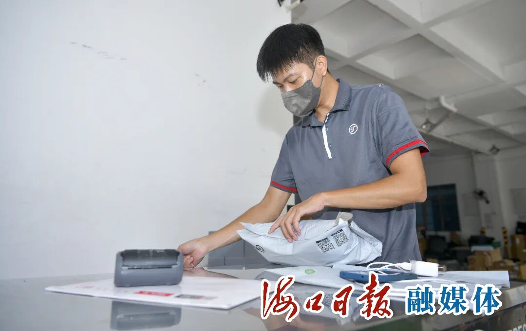 在海南顺丰速运有限公司汇水湾营业点,快递工作人员使用环保小袋打包商品。