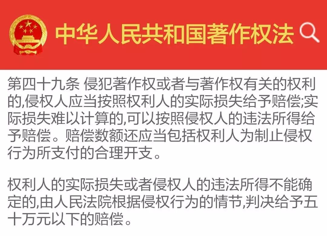 如果实际损失很难计算,比如于正用了琼瑶的结构,又改编成影视剧,计算琼瑶的实际损失过于复杂,就以侵权人的违法所得为依据。这时候可能会有人问,某某公众号用了我的图片,他们在推送中加入了软广告,广告估计百八十万呢?!我的照片怎么也要赔五十万呢吧,不是的,因为你要证明使用照片和百八十万的广告费之间有因果关系,你要证明不是对方使用,而是你用也可以得到这么多的广告费,这时候你就会发现,他们能得到广告费是因为他们粉丝多。