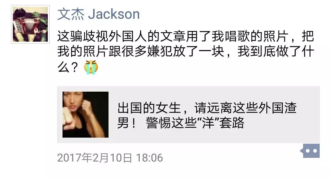 正如上面所说,这篇推送在公众号已被删除,但只要搜索“出国的女生,请远离这些外国渣男!”便找得到全文,文章中对于“外国渣男”进行的总结和概括,以及各种“渣男”“欺骗”“普遍素质都不高”等负面性语言词汇,其配图依然是文杰的单人照片。这样的文案搭配与客观事实不符,文杰照片下也未出现诸如:图片人物与本文无关等说明字样,容易使人进行联想,造成了当事人的社会评价降低,损害了当事人的名誉,给当事人带来了精神困扰。