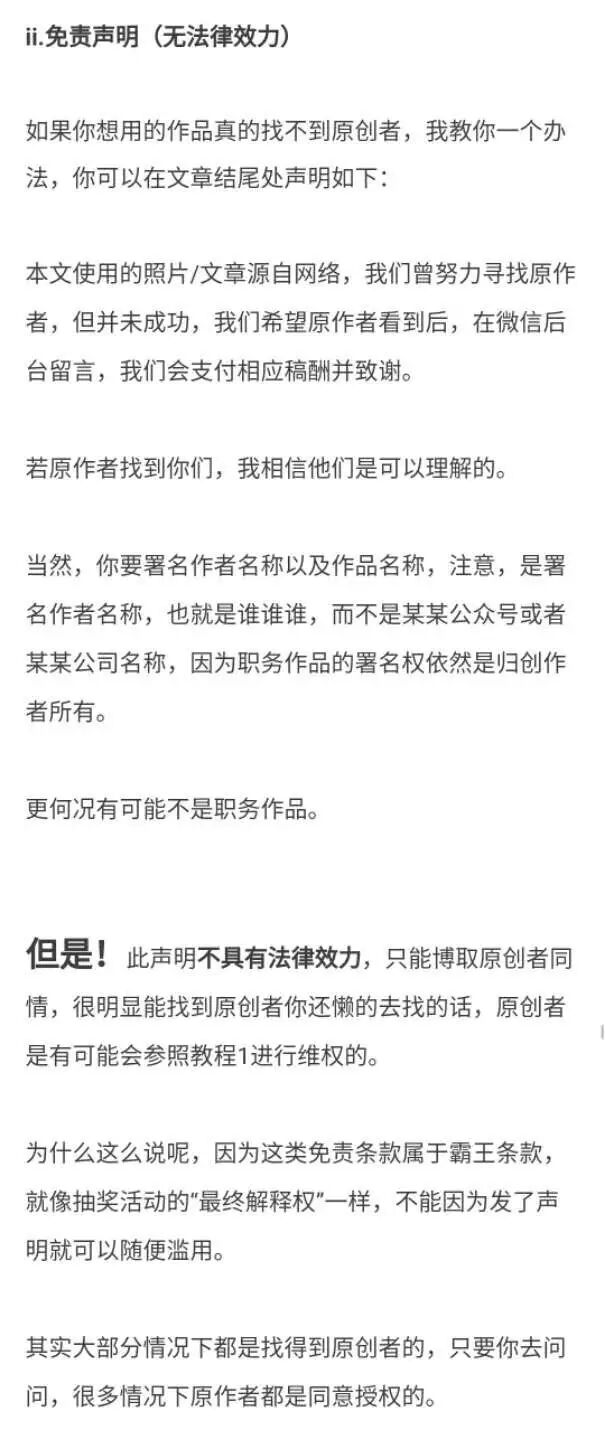 以上内容引用自知乎,就我对此公众号的观察而言,图片仅写“转载自网络”,并未注明来源,是涉嫌侵权的,我曾写过一篇关于知识产权保护的文章,其中关于免责声明是这样解读的: