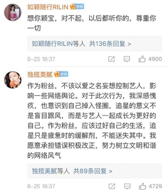 当下官方重拳出击,要求明星本人做出道德垂范,当然也会有一定效果,毕竟他们是饭圈认同的核心。赵丽颖工作室日前在被微博禁言15天后,赵丽颖本人公开发文表示“反省”:“诚恳地希望大家在网络上文明交流、和谐讨论、冷静发言。保持独立思考,对自己的言行负责。相互信任、共同成长,共筑和谐网络,维护健康的网络环境。”下面最高赞的留言就表示无条件服从:“想你颖宝,对不起,以后都听你的,尊重你一切。”