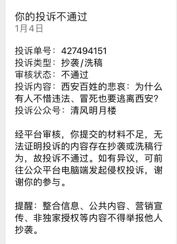 戏剧性的是,在我发起投诉、还未等到结果时,他那篇倒是自删了,原因是他照抄了我文中的一段,提到西安这次密接隔离须自费5000元,被很多人抓住攻击,即便他被迫宣布“24小时删”,但还是有人不依不饶地把他发到了“黑榜”上。