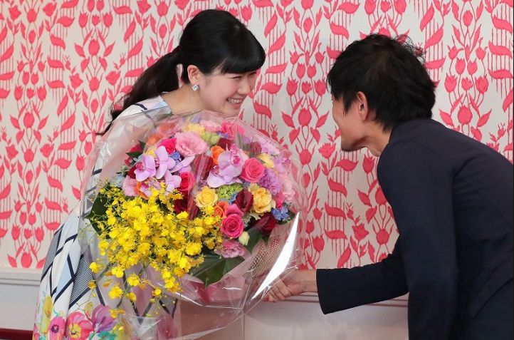 ▲福原爱在记者会后接过花束(图源:日本每日新闻)